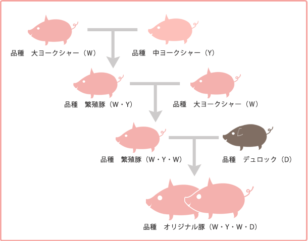 当社では、「中ヨークシャー」をベースに大ヨークシャー、デュロックを掛け合わせたオリジナル交配豚を肥育しています。